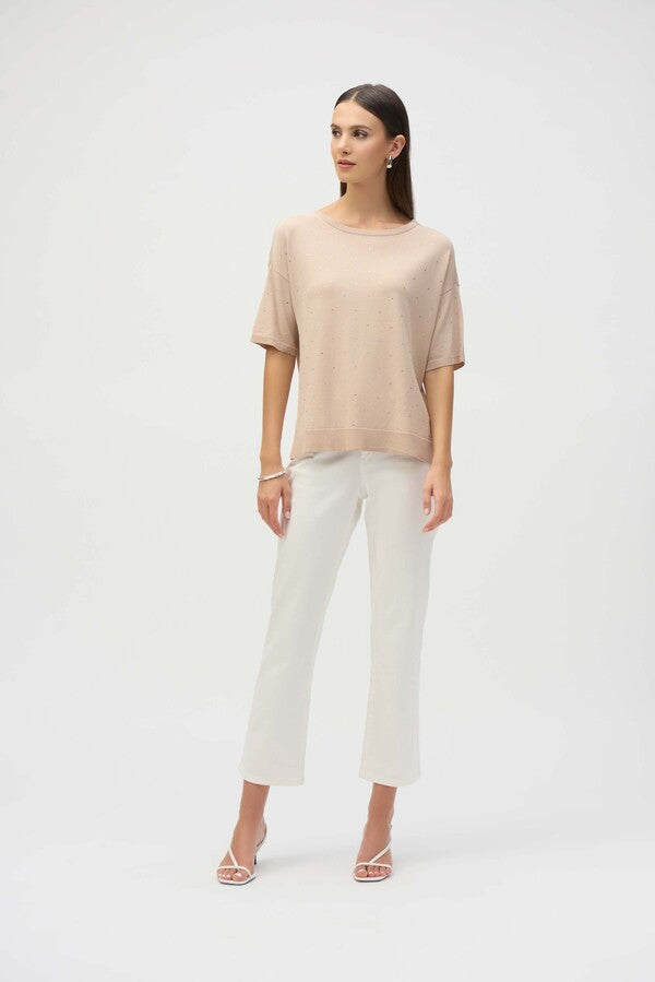 Discover the perfect blend of chic and casual with this Joseph Ribkoff pullover. Featuring a relaxed fit and hip-length design, it offers effortless comfort and style. The crew neck and jewel embellishments add a touch of elegance, while the short, straight sleeves ensure versatility for both casual and semi-formal occasions. Embrace the plain pattern for a timeless, sophisticated look.