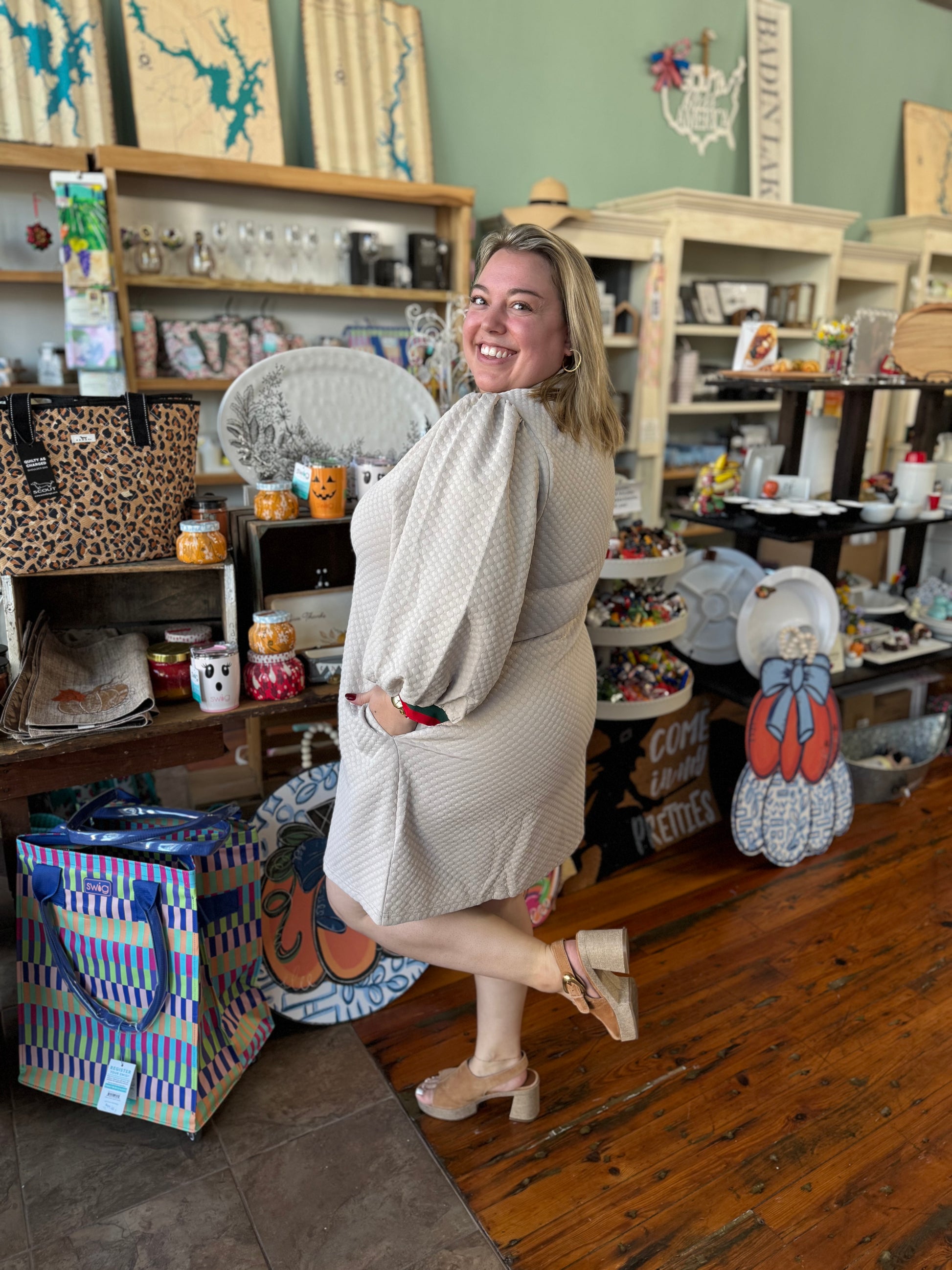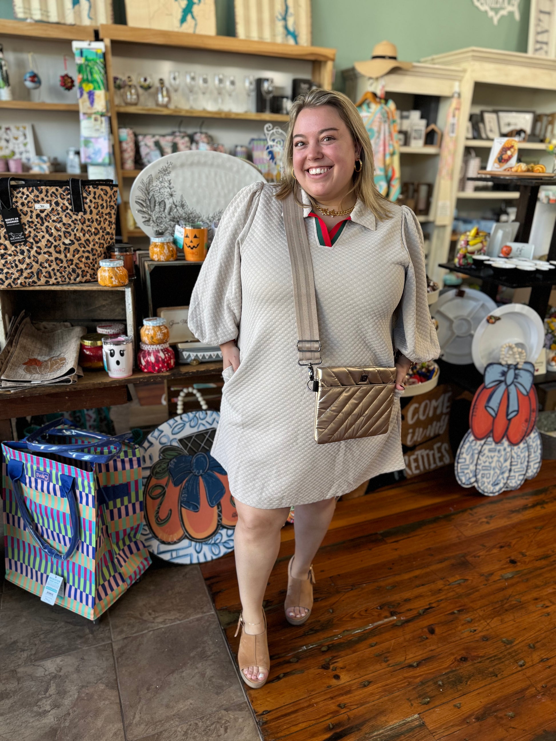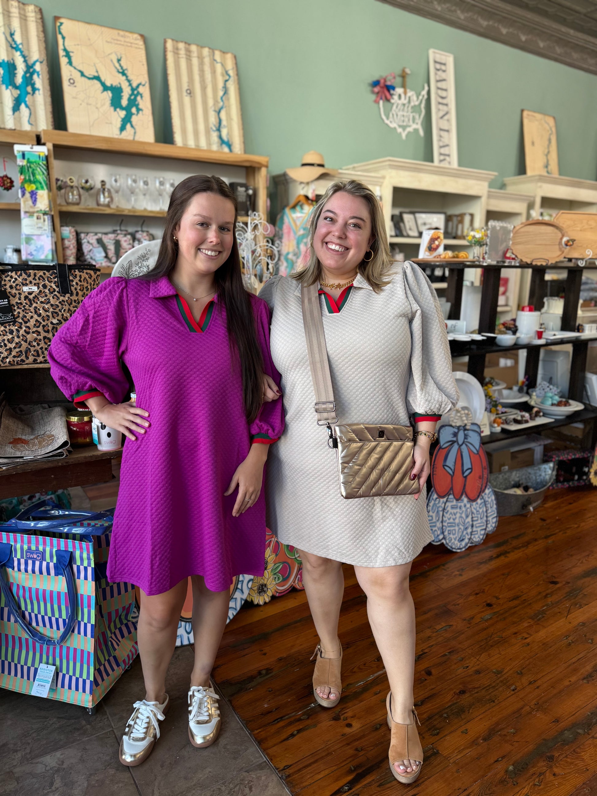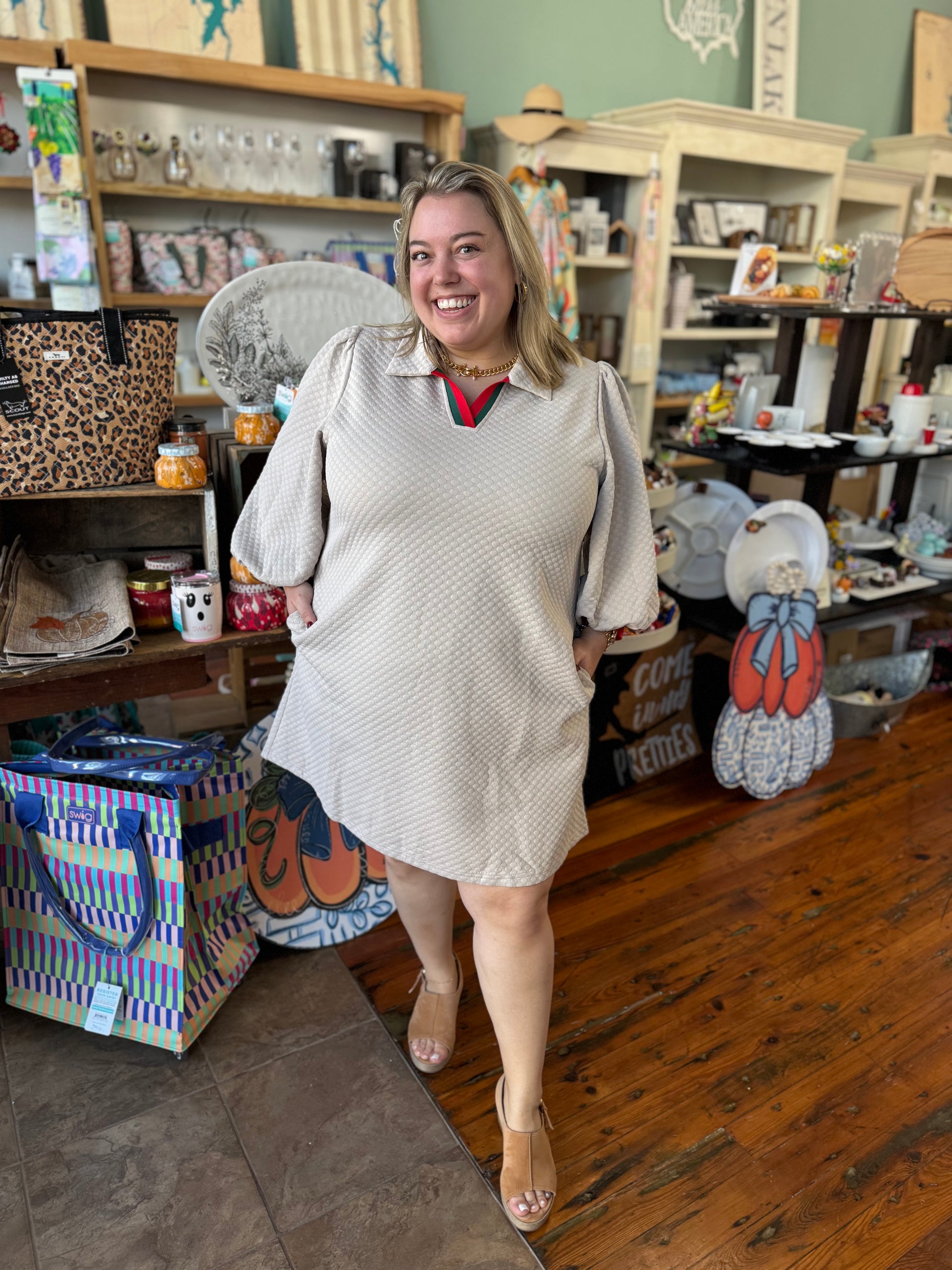 The cutest fall dress! Features a soft textured material, pockets, and red and green stripe details around the neckline and wrists.